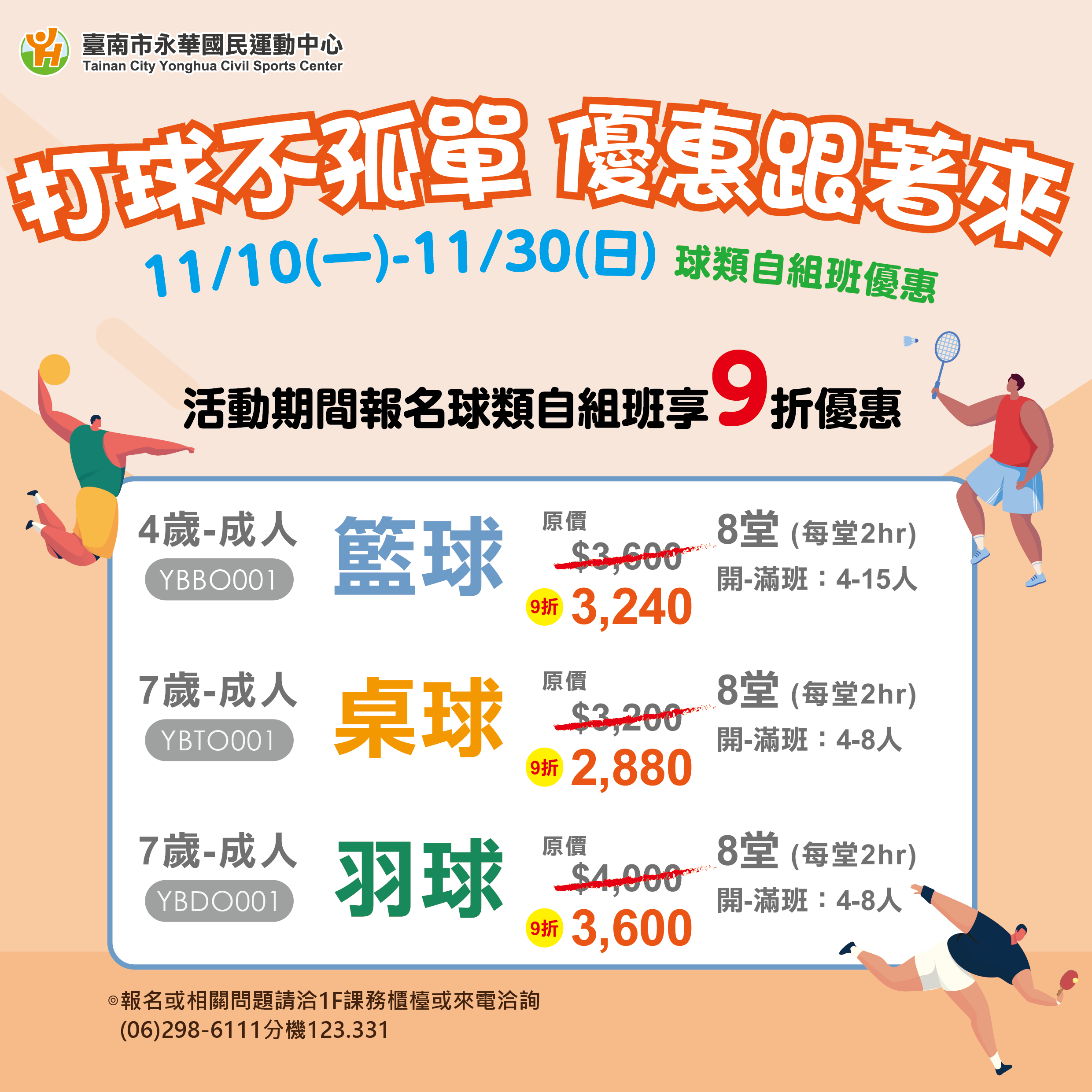 ◖ 活動期間報名球類自組班,享 9 折優惠 ◗